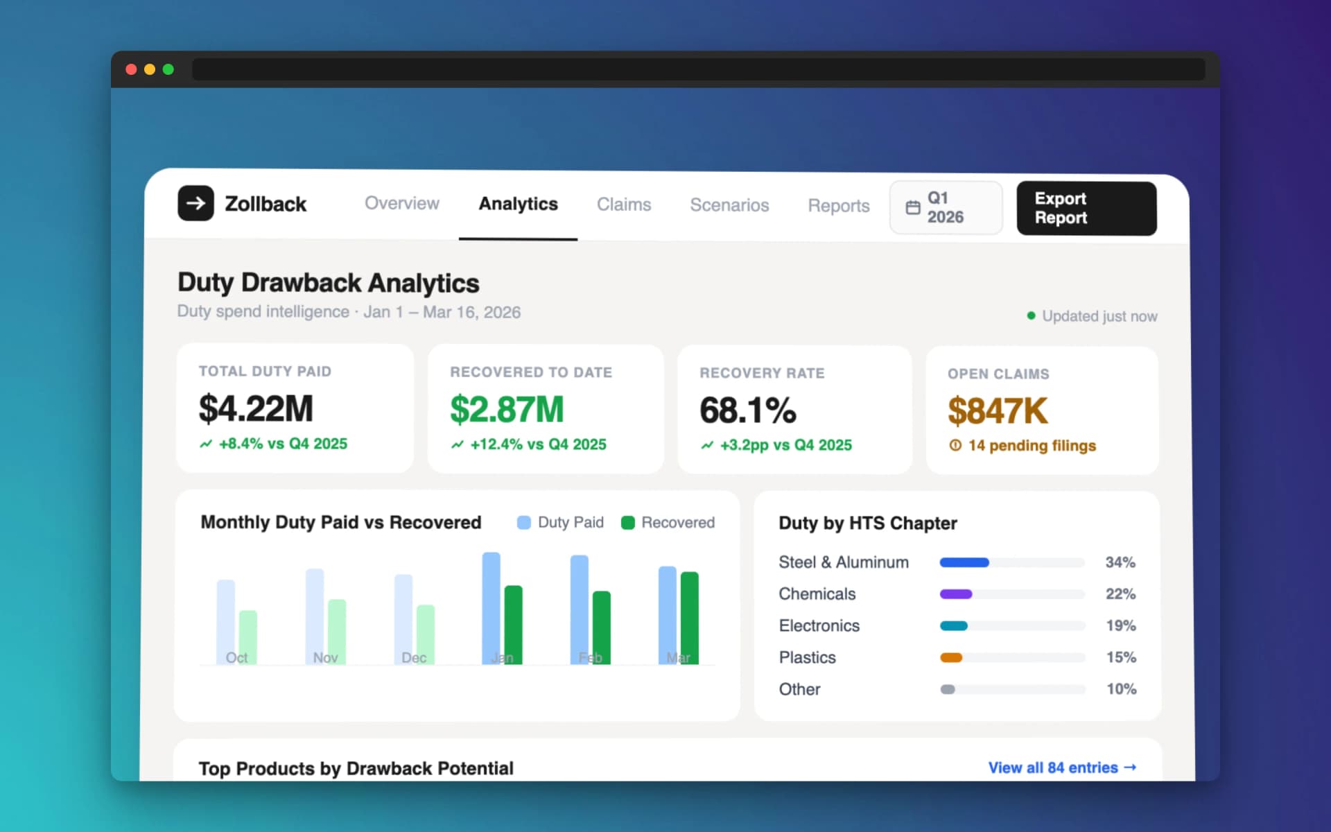 Traditional drawback providers deliver a check and a summary. Zollback's duty drawback analytics engine goes further — producing data-driven reports on duty spend across products, suppliers, HTS codes, and trade lanes. Because Zollback's AI structures every document it ingests, your trade data becomes a queryable, analyzable asset. CFOs and supply chain VPs can finally answer questions that manual providers cannot: which product lines generate the most recoverable duties, which suppliers drive the most drawback-eligible transactions, and how tariff shifts affect your recovery potential.