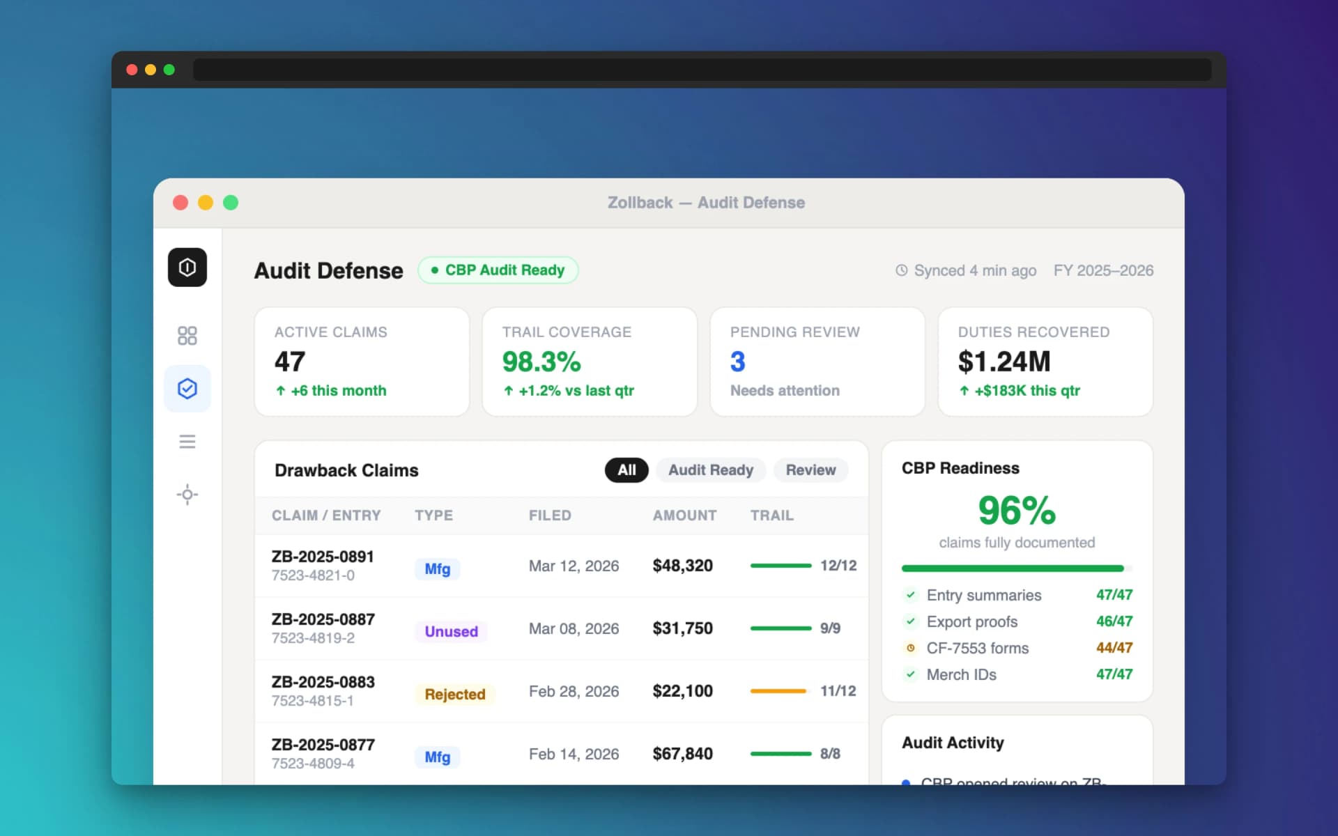 Every Zollback claim is built with a complete, reproducible digital audit trail — so when CBP comes knocking, your drawback program is already prepared.