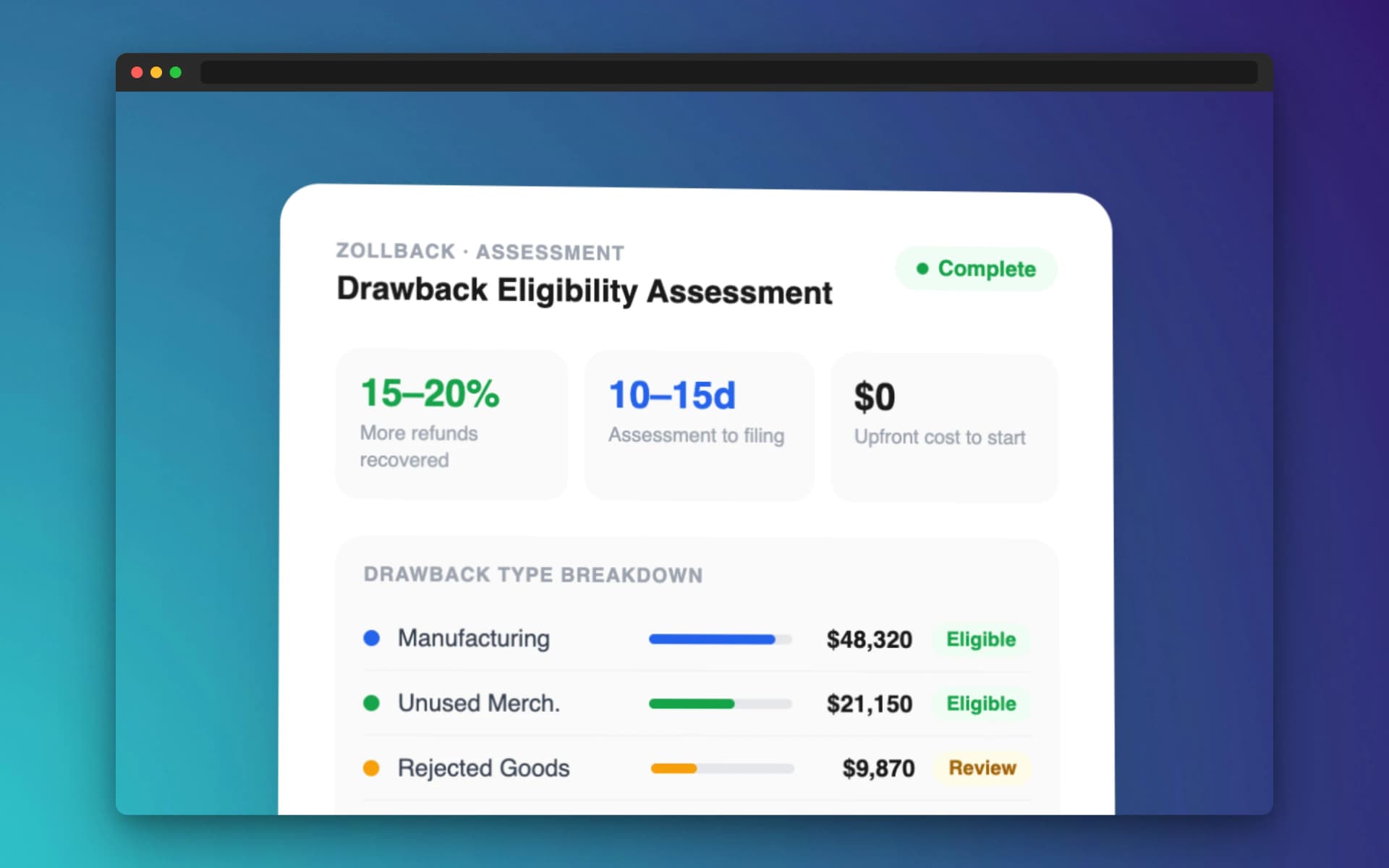 Run a free drawback eligibility assessment with Zollback. No upfront fees — you only pay when your refund is recovered.