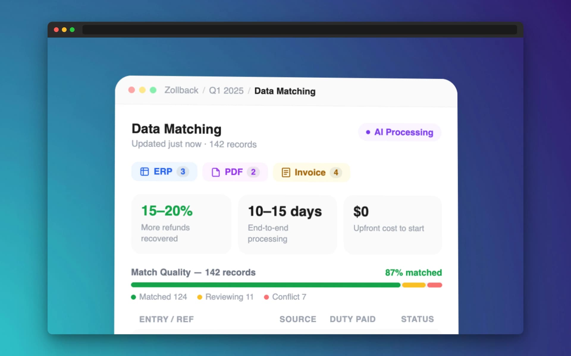 Duty drawback data matching requires connecting import entries to export shipments at the record level — across HTS codes, units of measure, quantities, and timelines — often sourced from 5 to 15 different internal systems. Traditional providers spend months copying data line by line into legacy desktop software. Zollback's AI automatically ingests any document format, maps fields to a common schema, resolves entity mismatches across trade partners, and produces a clean, audit-ready dataset optimized for maximum refund recovery.