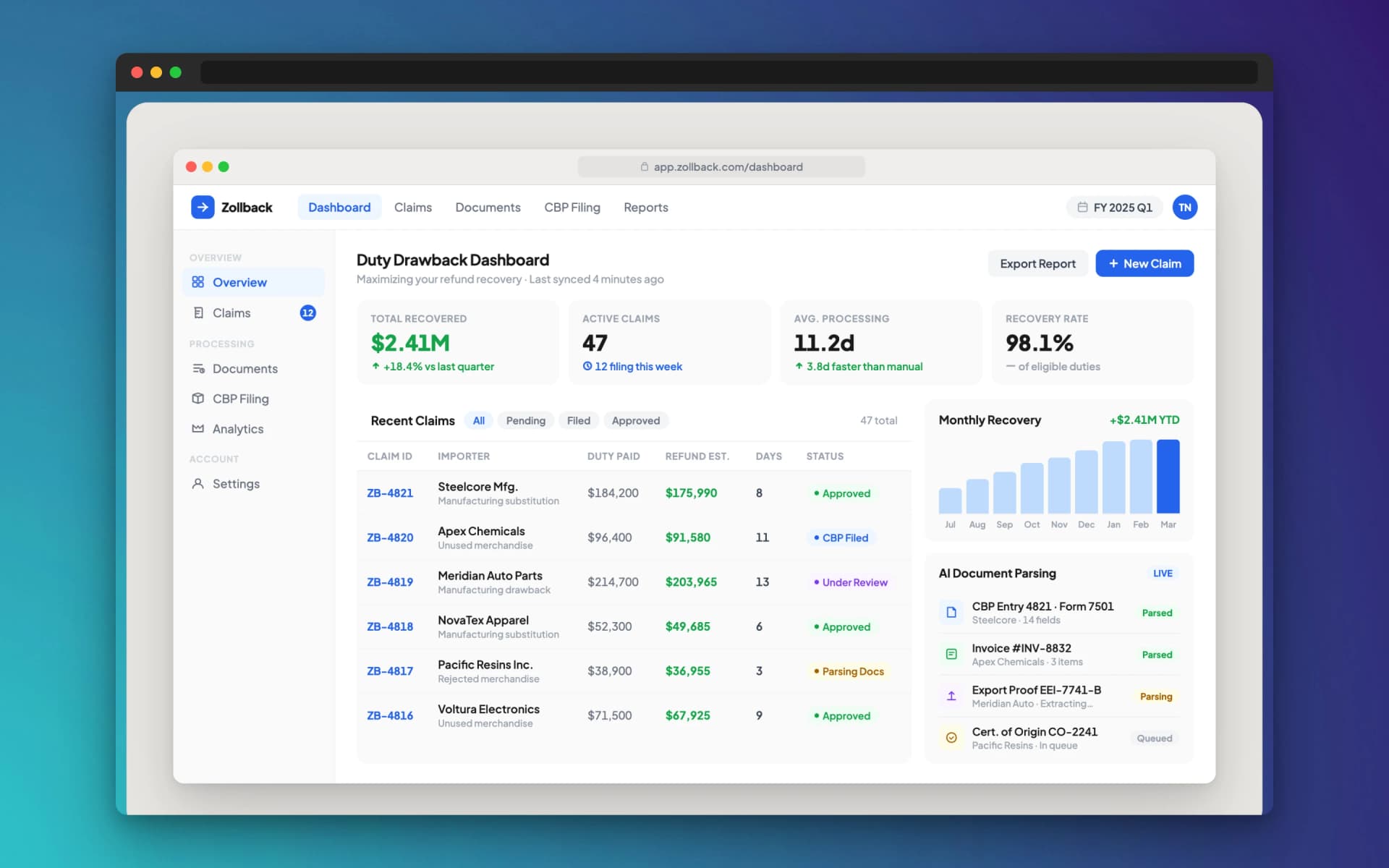Rather than a one-time annual project, Zollback continuously monitors your import and export activity to identify and file new eligible claims automatically. A real-time dashboard provides full visibility into claim status and refund amounts at every stage.