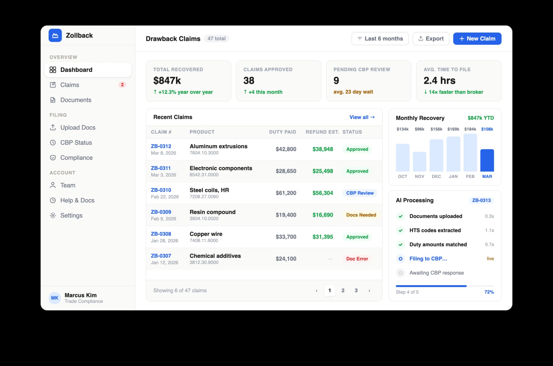 Upload your trade documents and Zollback's AI handles everything from parsing to CBP filing — no broker dependency, no upfront fees.